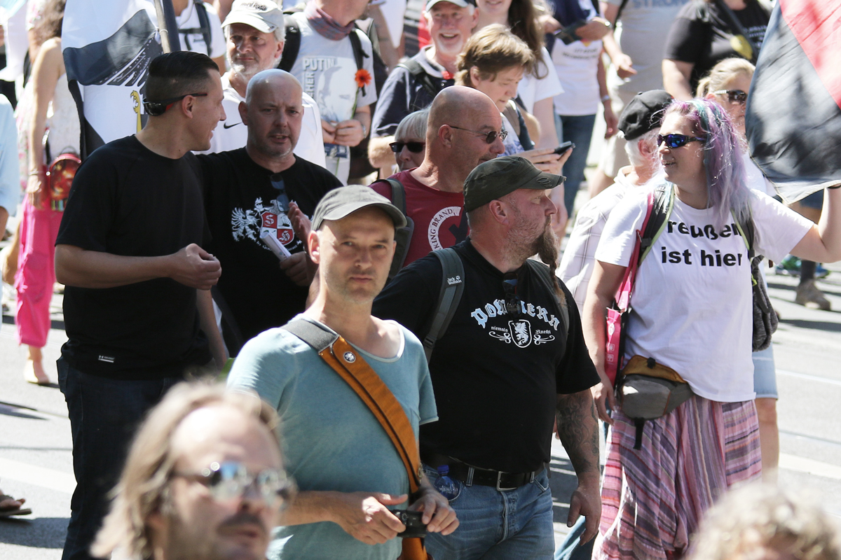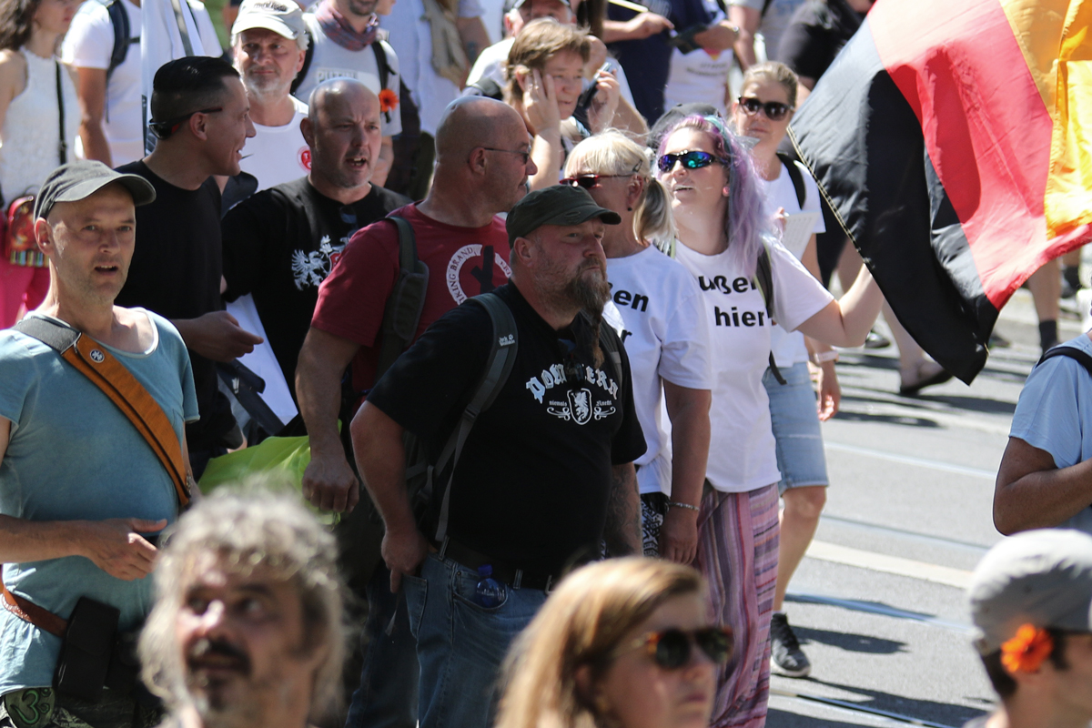Am 1. August 2020 zogen über 20.000 Verschwörungsideolog:innen durch Berlin, um gegen die Maßnahmen der Regierung zur Eindämmung des Coronavirus zu protestieren. Unter denen, die sich auf diesem Event als «Querdenker» und Verteidiger:innen des Grundgesetzes inszenierten, waren haufenweise extrem Rechte: FunktionärInnen der NPD, Kameradschafts-Mitglieder und sogenannte «Reichsbürger». Zwischen schwarz-weiß-roten Reichsfahnen und „Kill Bill Gates“- Plakaten reihte sich auch der Rechtsterrorist Martin Wiese in den Aufzug ein.