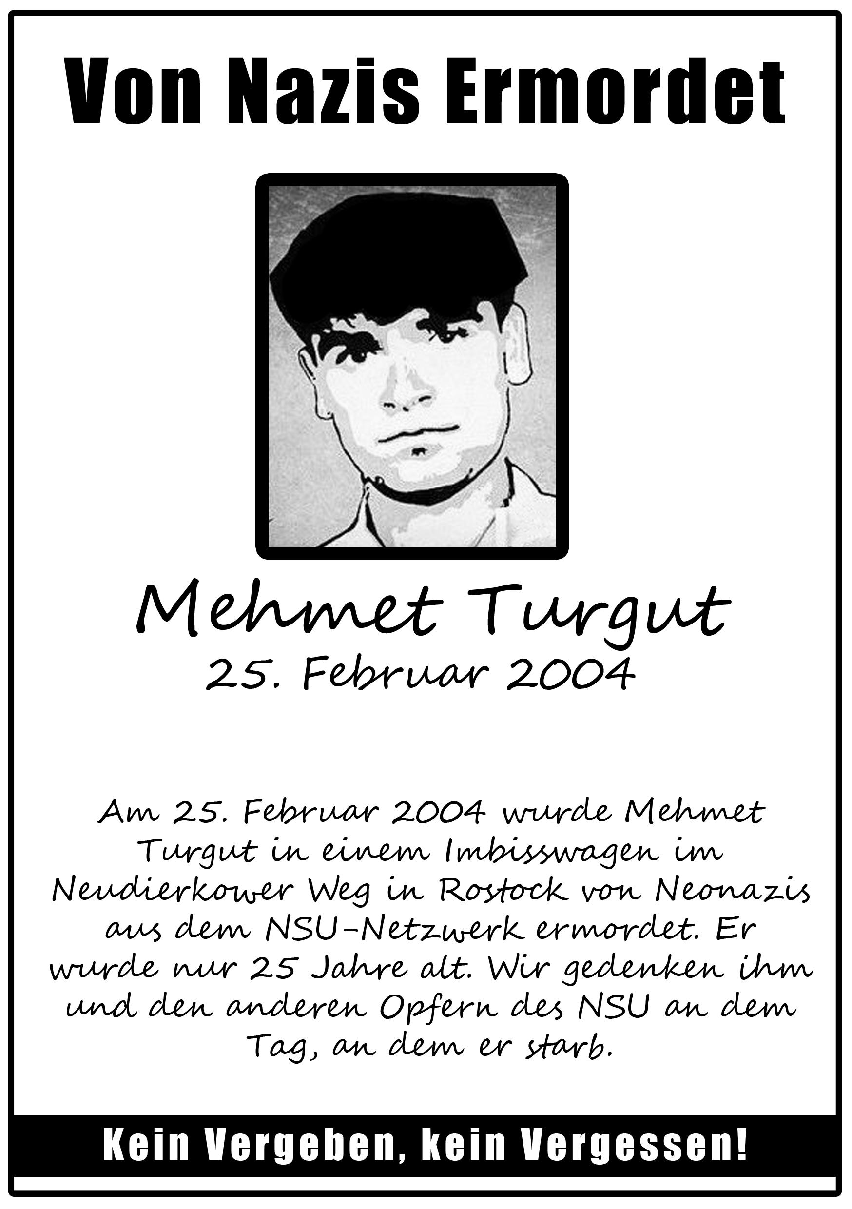 Am 25.02.2021 wurde in Neubrandenburg am Busbahnhof ein Transpi aufgehangen und Flyer in der Stadt verteilt. Der Anlass ist das Gedenken an Mehmet Turgut der am 25.02.2004 in Rostock von Neonazis aus dem NSU-Netzwerk ermordet wurde. Er wurde nur 25 Jahre alt.