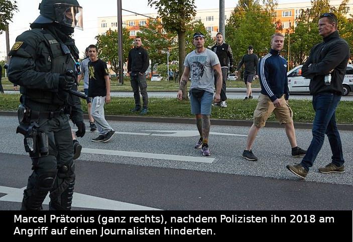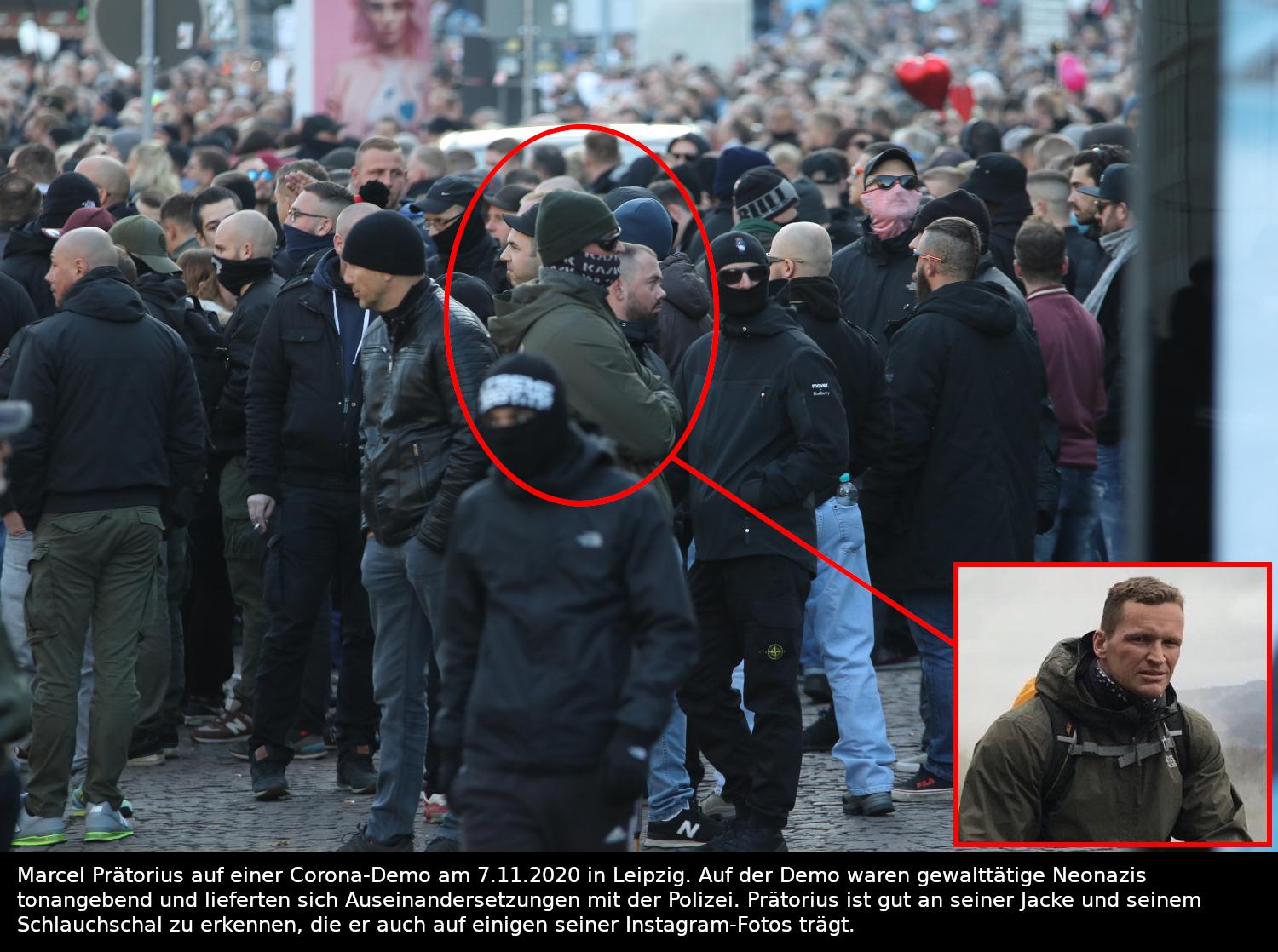 Während der Corona-Pandemie sorgten immer wieder „Corona-Demonstrationen“ für Aufsehen, bei denen es teilweise zu schweren gewalttätigen Ausschreitungen kam. Organisierte Neonazis nutzten diese Veranstaltungen, um sich Straßenschlachten mit der Polizei zu liefern und PressevertreterInnen anzugreifen. Dies zog selbstverständlich auch Marcel Prätorius an. So zeigen ihn Fotos auf einer Corona-Demonstration am 7.11.2020 in Leipzig. Die Demo sorgte für Schlagzeilen, da eine große Gruppe Neonazis Polizeiketten durchbrach und immer wieder Andersdenkende, MedienvertreterInnen und Polizisten angriff (6).