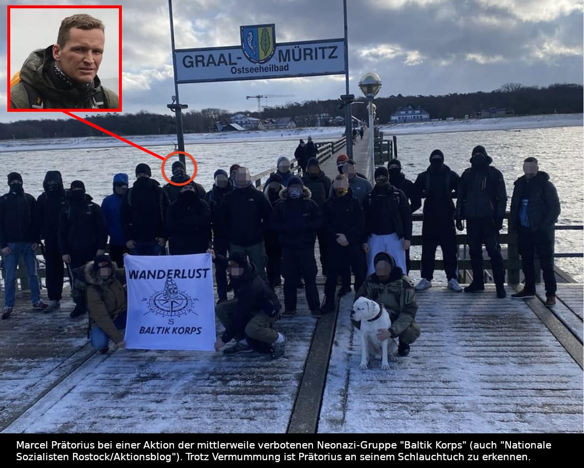 Über die Jahre hat sich Marcel Prätorius Gesinnung nicht geändert, genau so wenig wie sein Hang zur Gewalt. Dies stellte er unter Beweis, als er 2018 am Rande einer Demonstration versuchte einen Journalisten anzugreifen (2). Polizisten verhinderten das. Seine jüngsten politischen Umtriebe fanden im Umfeld der Kameradschaft „Nationale Sozialisten Rostock/Aktionsblog/Baltik Korps“ statt. Diese Kameradschaft trainierte Rechtsextreme für den Straßenkampf gegen Andersdenkende. Aufgrund ihrer verfassungsfeindlichen Einstellung und ihrem Hang zur Gewalt wurde die Gruppe vor wenigen Wochen verboten (3). Auf Bildern der Gruppierung zeigt sich Prätorius meist vermummt (4). Auch abseits von Foto-Shootings trat Prätorius mit anderen Mitgliedern der Nationalen Sozialisten Rostock auf. So nahm er beispielsweise am 16.11.2018 in Rostock zusammen mit David Mallow an einer AfD-Demonstration teil (5). David Mallow ist nicht nur der Kopf der Nationalen Sozialisten Rostock, sondern auch deutschlandweit bekanntes Aushängeschild der rechtsextremen Kampfsportszene.
