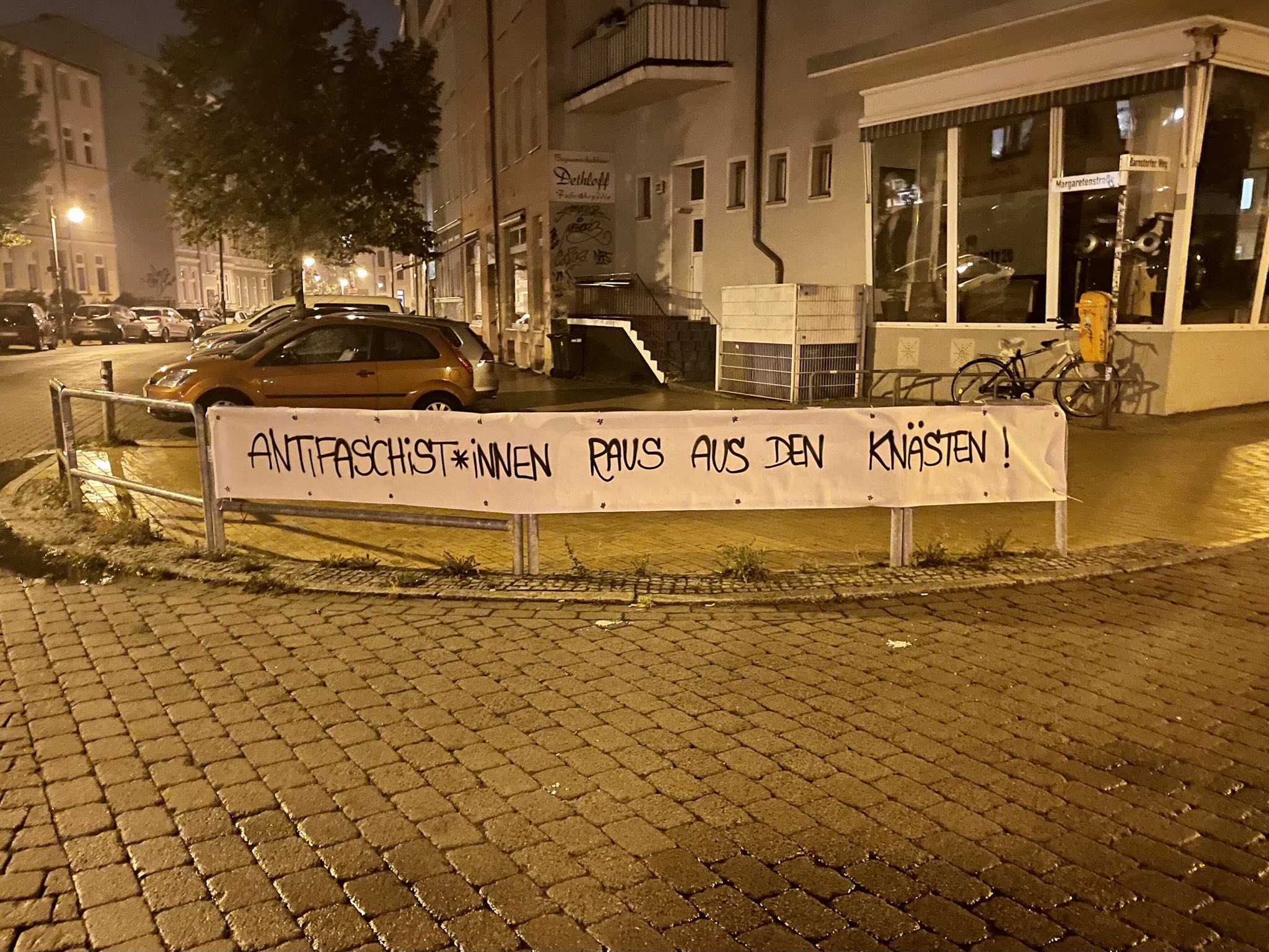 Der Rechtsruck schreitet immer weiter voran, Nazis werden in der Mitte der Gesellschaft akzeptiert. Als Antifaschist:innen ist es unsere Pflicht, uns gegen diese Strukturen zu radikalisieren und da zu agieren, wo der Staat versagt: nämlich Nazis zu bekämpfen. Fast täglich erreichen uns Nachrichten darüber, dass Bullen oder Bundeswehr Munition klauen, um politische Gegener:innen auszuschalten. Da kann man als Bundesanwaltschaft auch schon mal ruhig bleiben und lieber Lina mit dem Helikopter nach Kassel in U-Haft fliegen, statt sich um Franco A., der sich 2017 als Geflüchteter ausgab, eine Waffe auf dem Wiener Flughafen versteckte und damit einen Terroranschlag plante zu kümmern.