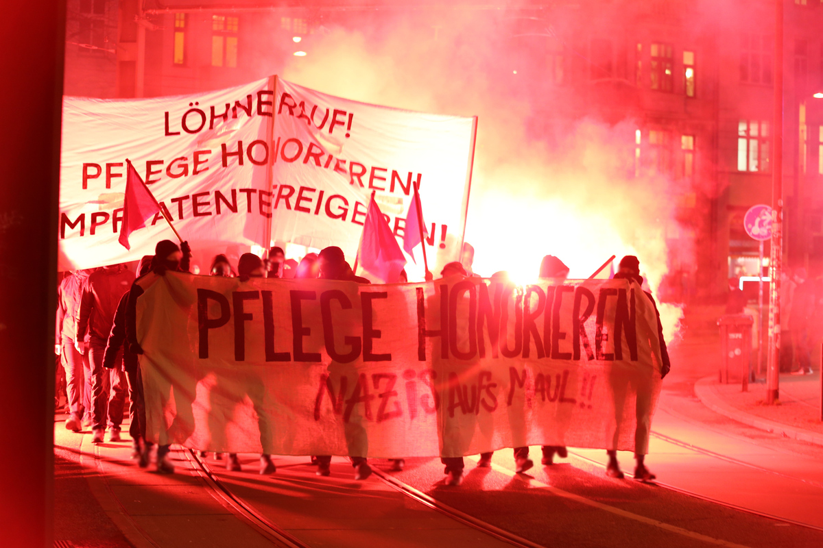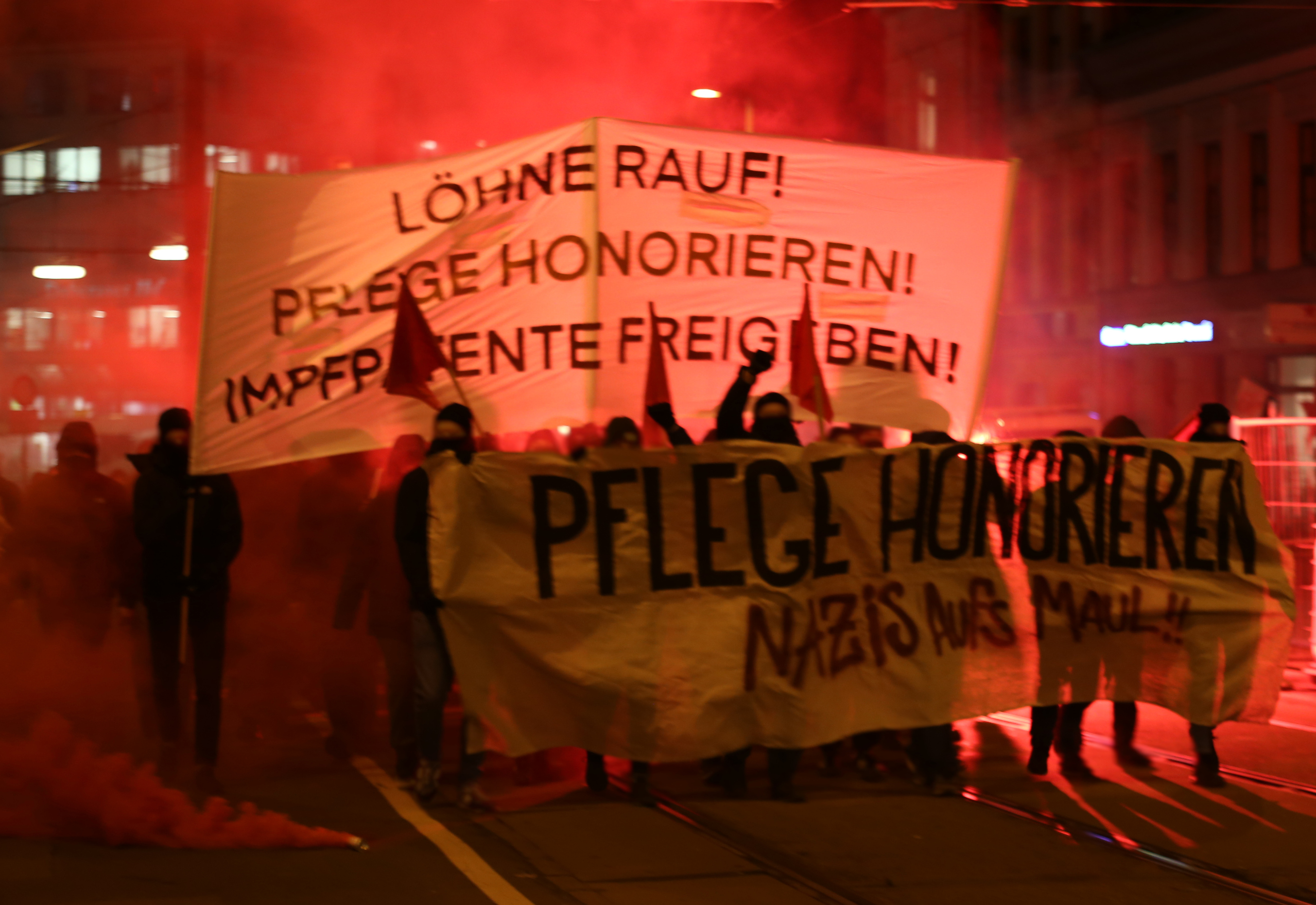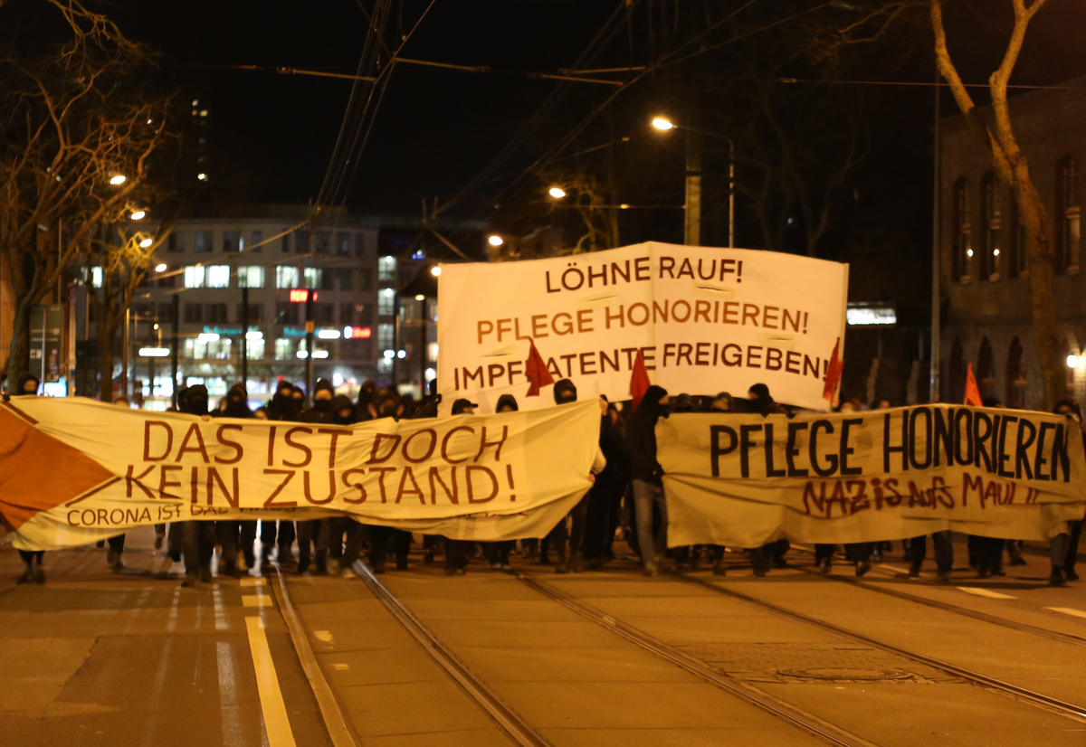 Wir haben kein Bock mehr auf Corona, wir haben kein Bock auf Nazis in unserer Stadt und auch kein Bock auf einen Staat für den Profit und Kapital wichtiger sind als die Gesundheit der Menschen.