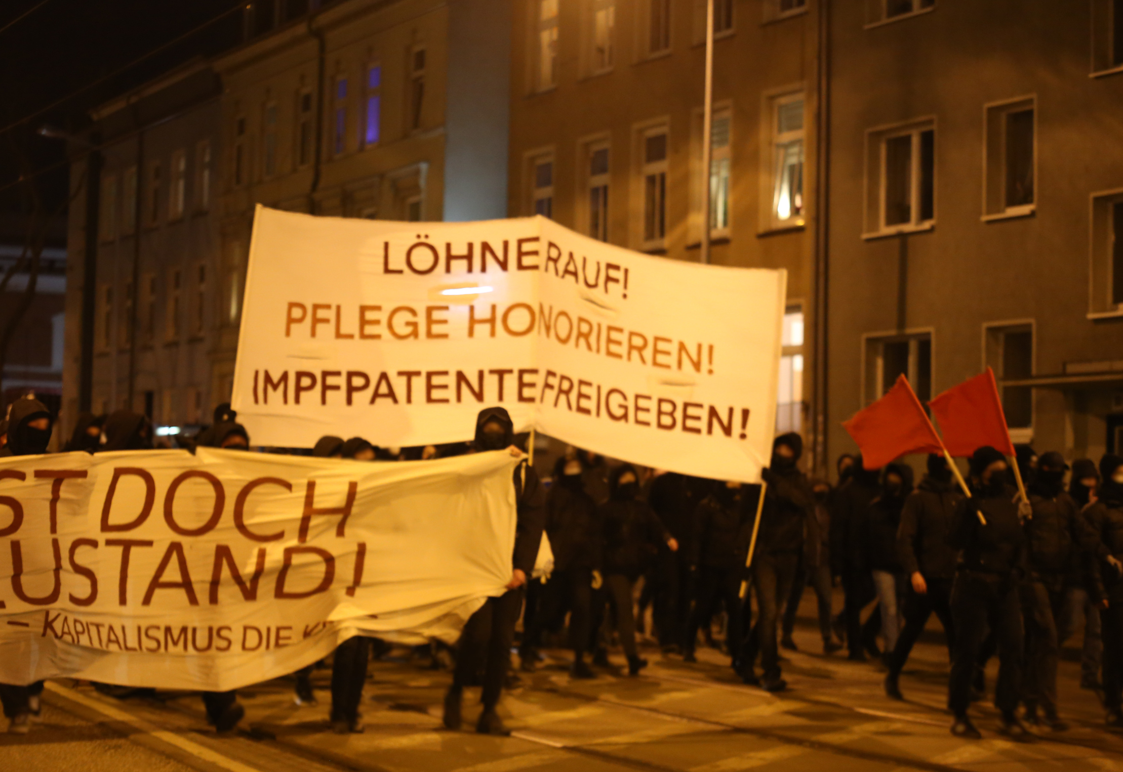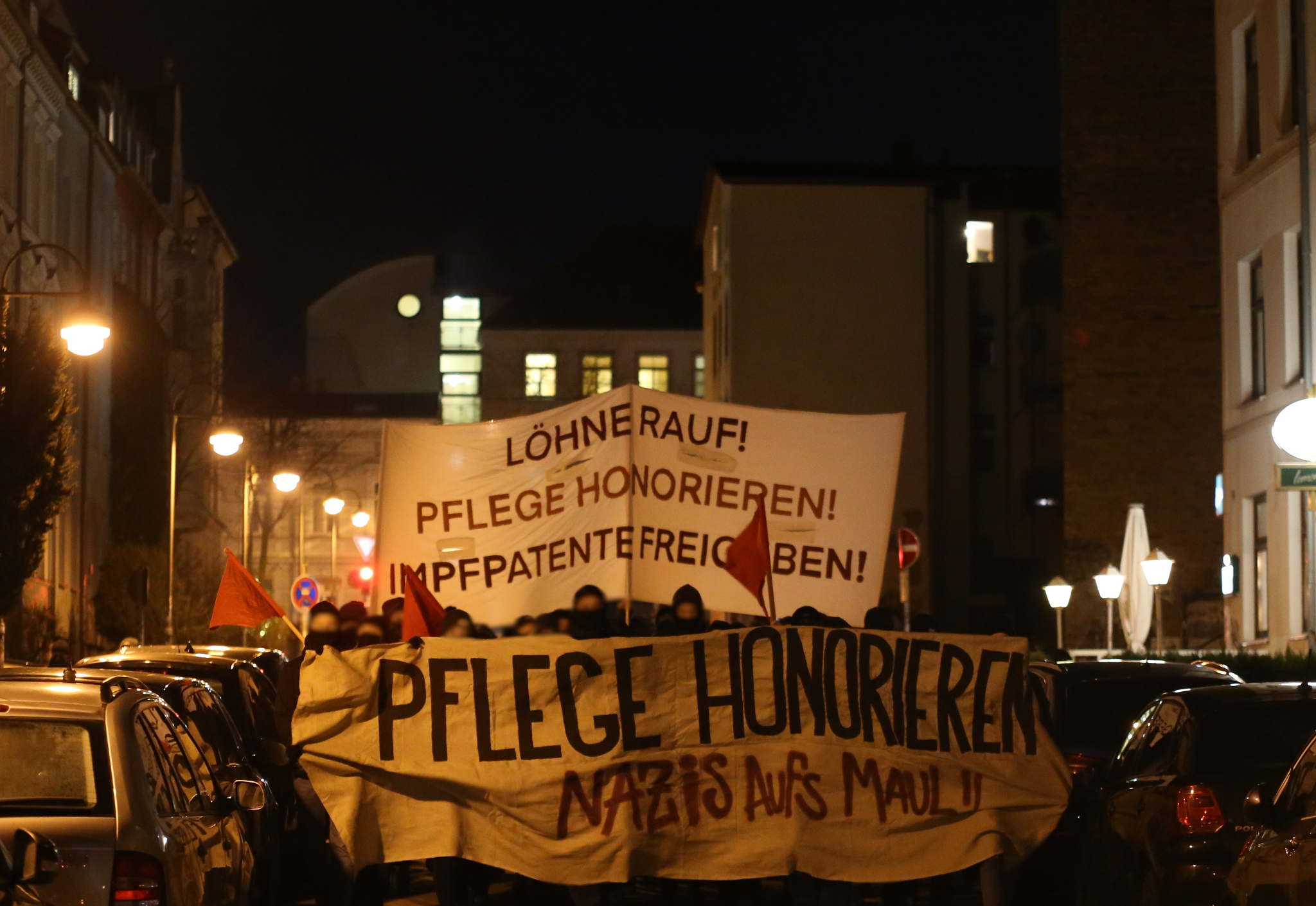 [Original erschienen unter https://de.indymedia.org/node/168867 ] Wir haben uns heute am Montag den 17.01. in Rostock versammelt um unsere Kritik an der Corona-Politik auf die Straße zu tragen. Die Demonstration richtet sich auch gegen die wöchentlich stattfindenden Querdenker:innen Demos in Rostock. Ca. 60 Menschen trafen sich am Magaretenplatz und zogen lautstark über den Doberaner Platz durch das Viertel. Mit Flyern die an Passat:innen verteilt wurden und durch verschiedene Transparente und Sprechchöre wurde eine linksradikale Perspektive auf die Corona Maßnahmen und die Rolle von Staat und Kapital in der aktuellen Krise deutlich gemacht.