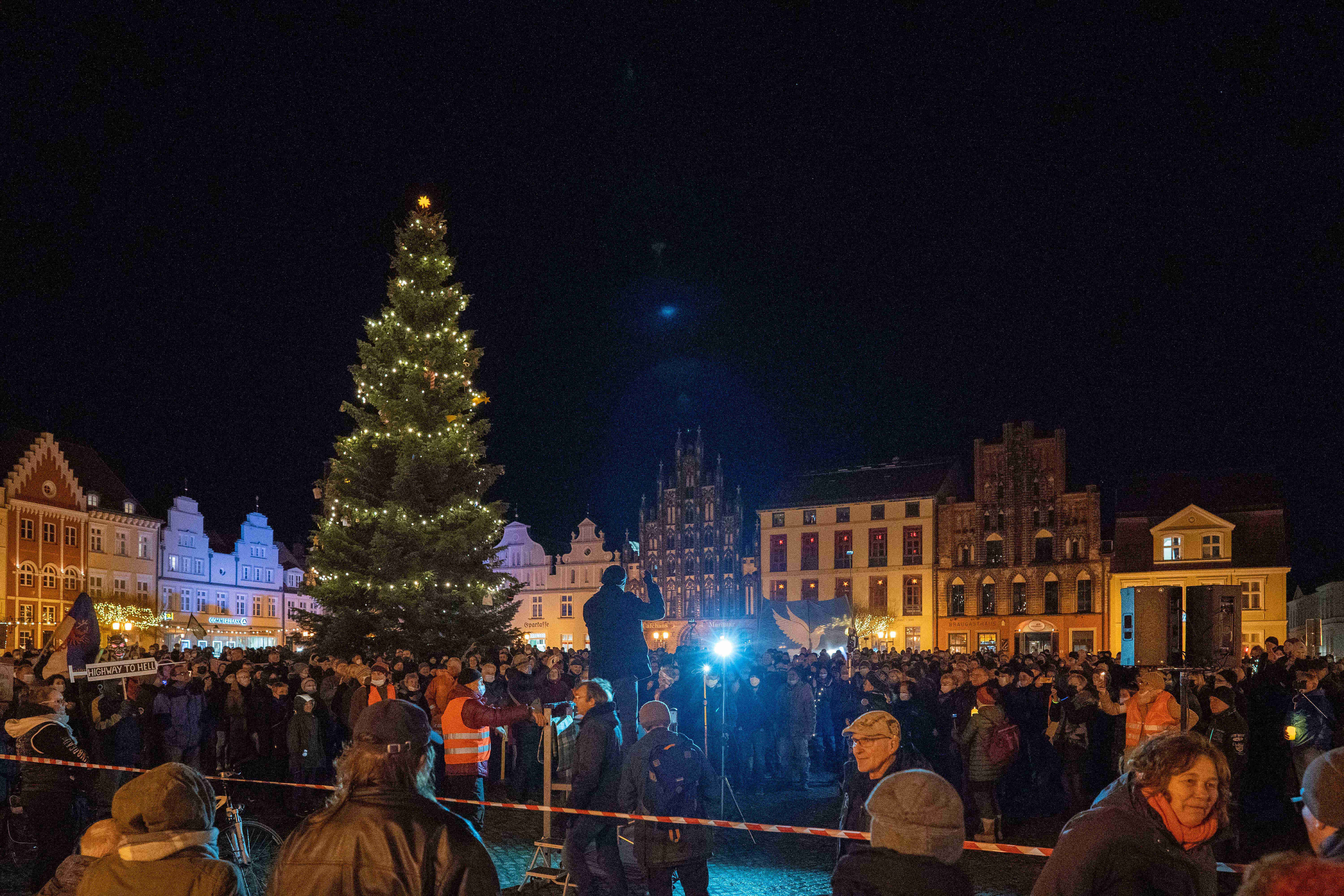 Auf den mittwöchlich von Sebastian Glaser veranstalteten und mittlerweile auch von Petra Albrecht-Kühl angemeldeten Versammlungen findet sich jegliche extrem rechte Schattierung wieder, die Vorpommern zu bieten hat. Im Vergleich mit den Veranstaltungen in Greifswald sind die vorgetragenen Reden auch deutlich weniger zurückhaltend.Eine Rede vom 29.12.2021 trieft nur so von antisemitischer Hetze und Bezügen zu NS-Ideologie.(8 Der Redner schwadroniert von einer Verschwörung, die dabei ist “ein Virus als Waffe zu benutzen” und spricht weiter: “Das was 1945 die Bomben waren, sind heute ihre Giftspritzen. Es ist ein unberechtigter Waffenbesitz einer kleinen, globalen, nutzlosen Klique, die die Menschheit versklaven wollen.”