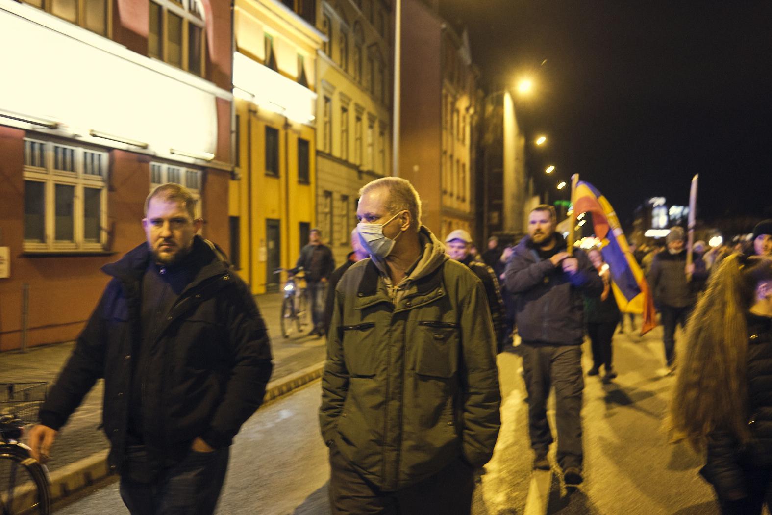 Bisher fanden die Rostocker „Heißer Herbst“-Demonstrationen vergleichsweise wenig Anklang bei den Kameraden. Regelmäßig anzutreffen sind dort Marcel Prätorius und Jan-Simon Heinelt. [Abb. 8] Guido Howald und Oliver Fischer nahmen bisher nur unregelmäßig teil. Von David Mallow ist bisher der Besuch auf einer „Heißer Herbst“ Demonstration in Güstrow belegt.