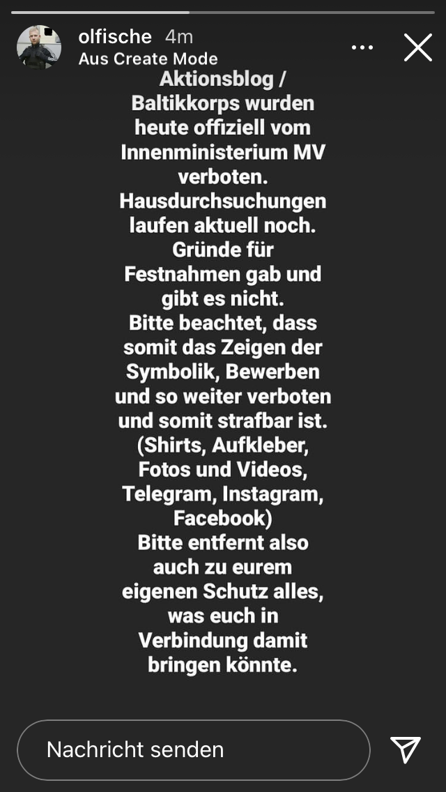 Die Reaktion der Szene auf die Hausdurchsuchungen und das Verbotsverfahren kam prompt, ging jedoch nicht über Social Media hinaus. Wenige Stunden nach den Hausdurchsuchungen solidarisierte sich der Instagram-Account des „Kampf der Nibelungen“ mit den Kameraden aus Mecklenburg-Vorpommern. Der von Oliver Fischer gut gepflegte Social-Media-Auftritt des Aktionsblogs auf Instagram wurde komplett gelöscht, der Account zu „staatsschutzmv1“ umbenannt. Ebenso erfolgte eine Umbenennung des Telegram_Kanals in „Wir sind verboten- na und?“. Eine klare Ansage. Noch am selben Tag informierte Fischer mit seinem Privataccount über das Verbotsverfahren [Abb. 1]. In den nachfolgenden Wochen fungierte der Privataccount Fischers als Aktionsblog-Ersatz. So postete er einige Tage nach den Hausdurchsuchungen ein Aktionsblog-Aftermovie („Wir sagen Danke!“) und ein Solidaritätsvideo, welches er kurze Zeit später löschte, um es auf einem gesonderten Kanal wieder hochzuladen. Dieses stammt sehr wahrscheinlich aus der Vernetzung des Aktionsblogs zu „Werra Elbflorenz“ und der „Junge Tat Bewegung“ aus der Schweiz.
