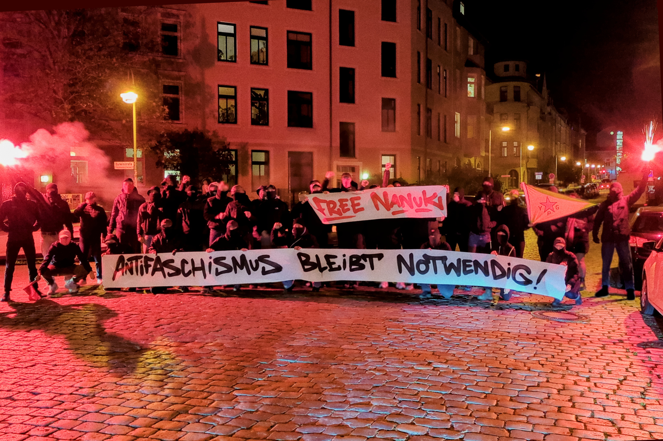 Nanuk wird vorgeworfen, eine kriminelle Vereinigung im Rahmen des Antifa-Ost-Komplex unterstützt zu haben, sowie an Silvester 2018/2019 mit anderen die BGH-Außenstelle und eine Burschenschaft in Leipzig angegriffen zu haben. Seit 2022 konnten ihn die deutschen Bullen trotz Haftbefehls nicht finden.