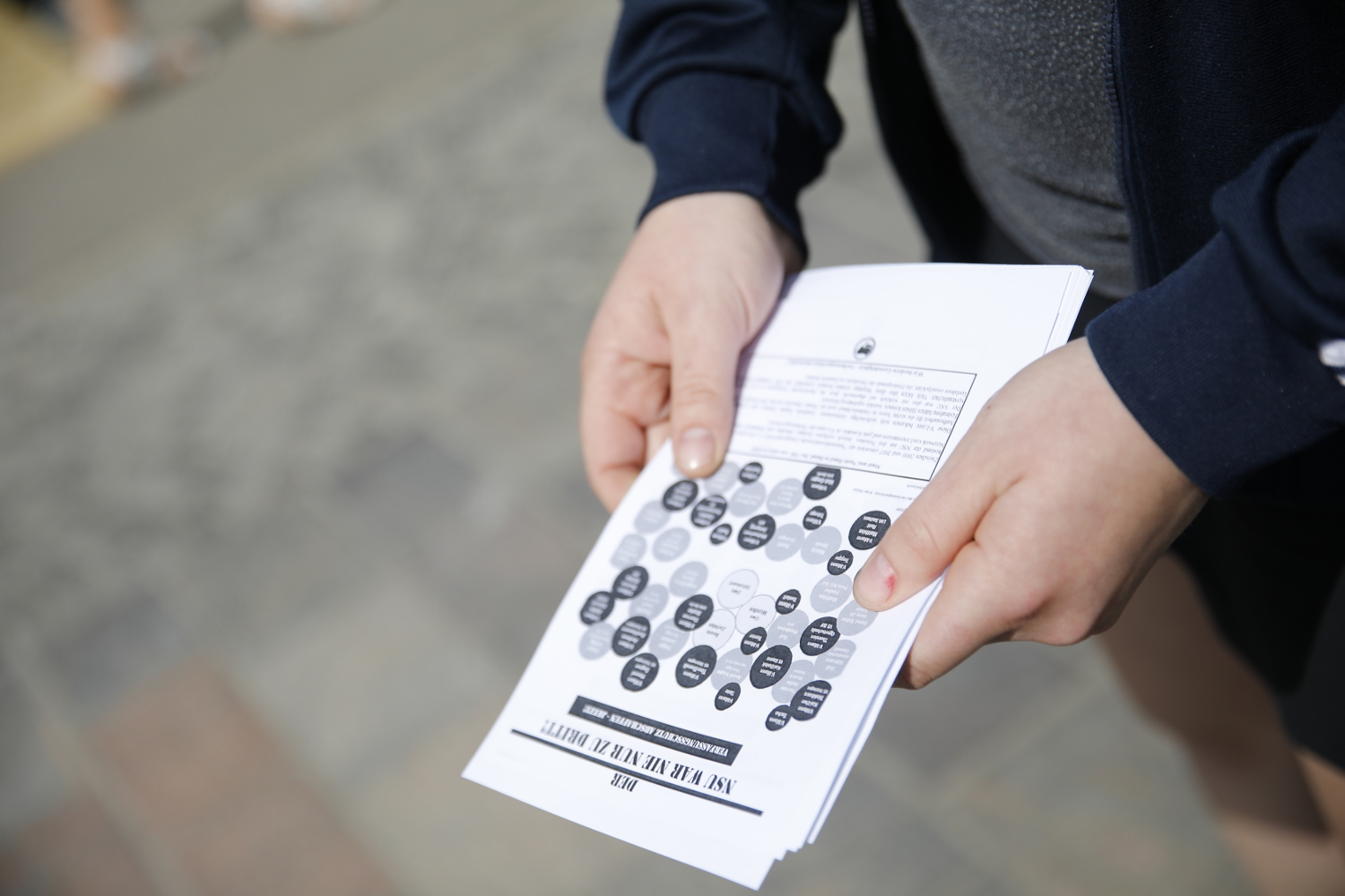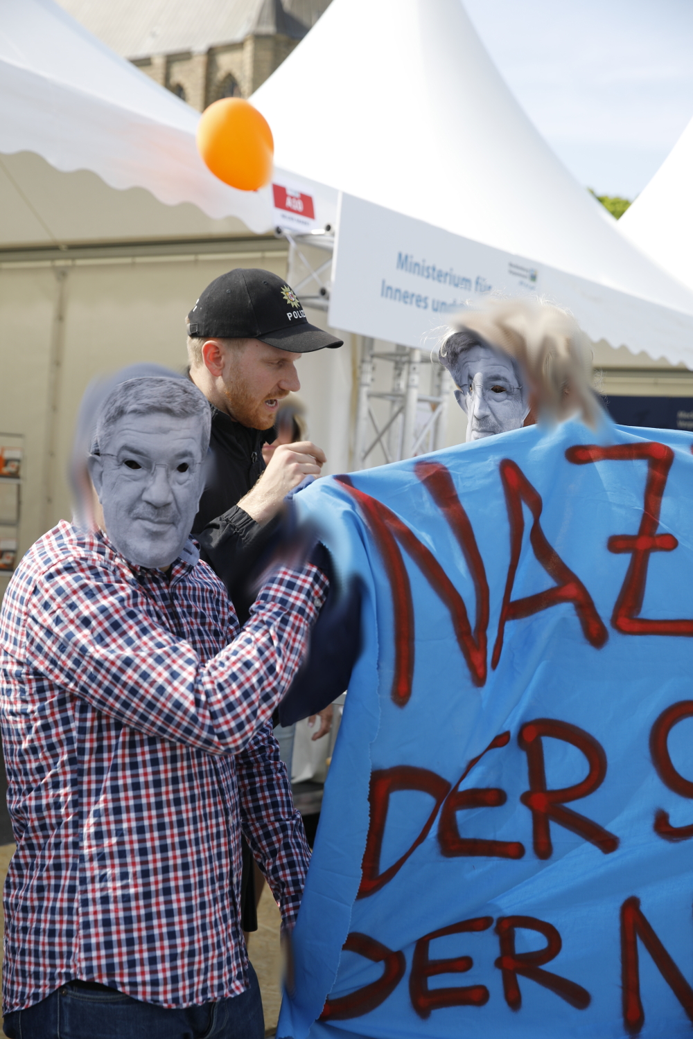 Hierbei wurde mit Hilfe eines Transparentes der Stand des VS abgeschirmt. Durch das Verteilen von Flyern wurden Besucher*innen von der Mittäterschaft des Verfassungsschutzes in der Mordserie des National Sozialistischen Untergrunds (NSU) informiert. Desweiteren wurde der Stand, sowie die Umgebung mit Schnipseln eingedeckt, welche auf die Kampange „Kein Schlussstrich“ hinweisen. Die Kampange beschäftigt sich mit dem Ende des NSU Prozesses, dass ende Juni erwartet wird. Die Aktion stoß auf breite Zustimmung bei Passanten*innen, auch die Mitarbeiter*innen des Verfassungsschutzes machten sich einige Gedanken und fotografierten eifrig mit ihren Handys.