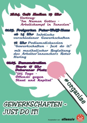 Für den Schraubenzieher im System, der den Kapitalismus nicht nur kurzzeitig ins Stocken geraten lässt, sondern diesen langfristig lahmlegt. Auch du bist 365 Tage im Jahr von Abwertung und Ausbeutung betroffen! Deshalb komme auch Du mit uns am 2.Mai auf die Straße und kämpfe offensiv gegen Staat und Kapital!