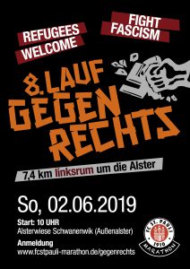 am Sonntag den 2. Juni findet auch dieses Jahr der „Lauf gegen Rechts“ links rum um die Alster statt (ca. 7,4 km) und auch dieses Jahr ist der Infoladen mit einem eigenen Team am Start (wortwörtlich). Wenn auch du dabei sein möchtest, dann melde dich doch bis zum Tag der Befreiung vom Faschismus (8. Mai) bei uns an (Mail an [email protected], Stichwort: Läuft bei dir Antifa).