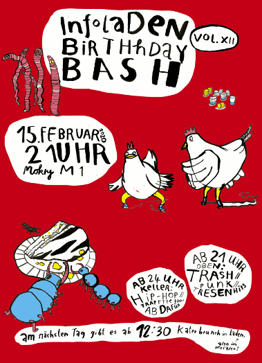 Am nächsten Tag gibt’s dann ab 12.30 Uhr Katerbru(n)ch im Infoladen von der fulminanten Brunchgruppe, um die Feierrei gemütlich ausklingen zu lassen.