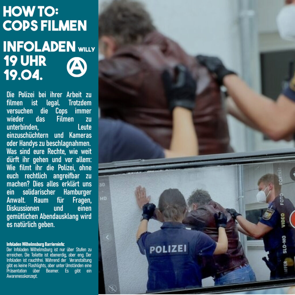Die Polizei bei ihrer Arbeit zu filmen ist legal. Trotzdem versuchen die Cops immer wieder das Filmen zu unterbinden, Leute einzuschüchtern und Kameras oder Handys zu beschlagnahmen. Was sind eure Rechte, wie weit dürft ihr gehen und vor allem: Wie filmt ihr die Polizei, ohne euch rechtlich angreifbar zu machen? Das alles erklärt ein solidarischer Anwalt. Das alles erklärt ein solidarischer Anwalt. Raum für Fragen, Diskussionen und einen gemütlichen Abendausklang wird es natürlich geben.