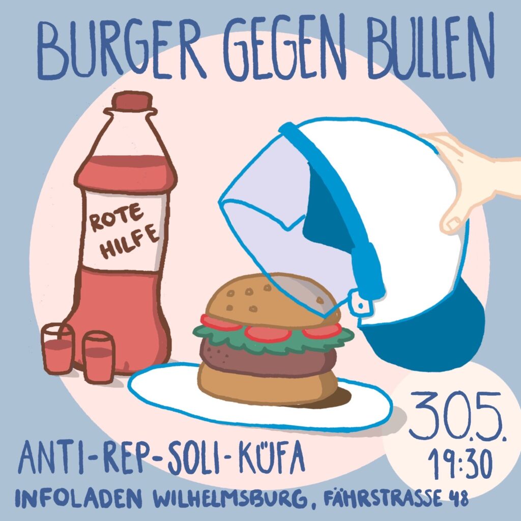 Habt ihr beim Hafengeburtstag die leckeren Burger von Vegan Deluxe vermisst? Am 30.05. habt ihr die Gelegenheit: wir braten euch Seitan-Patties und schenken dazu unsere selbstgemischte Rote Hilfe aus. Alle Spenden sind für Repressionskosten. Sagt es weiter!