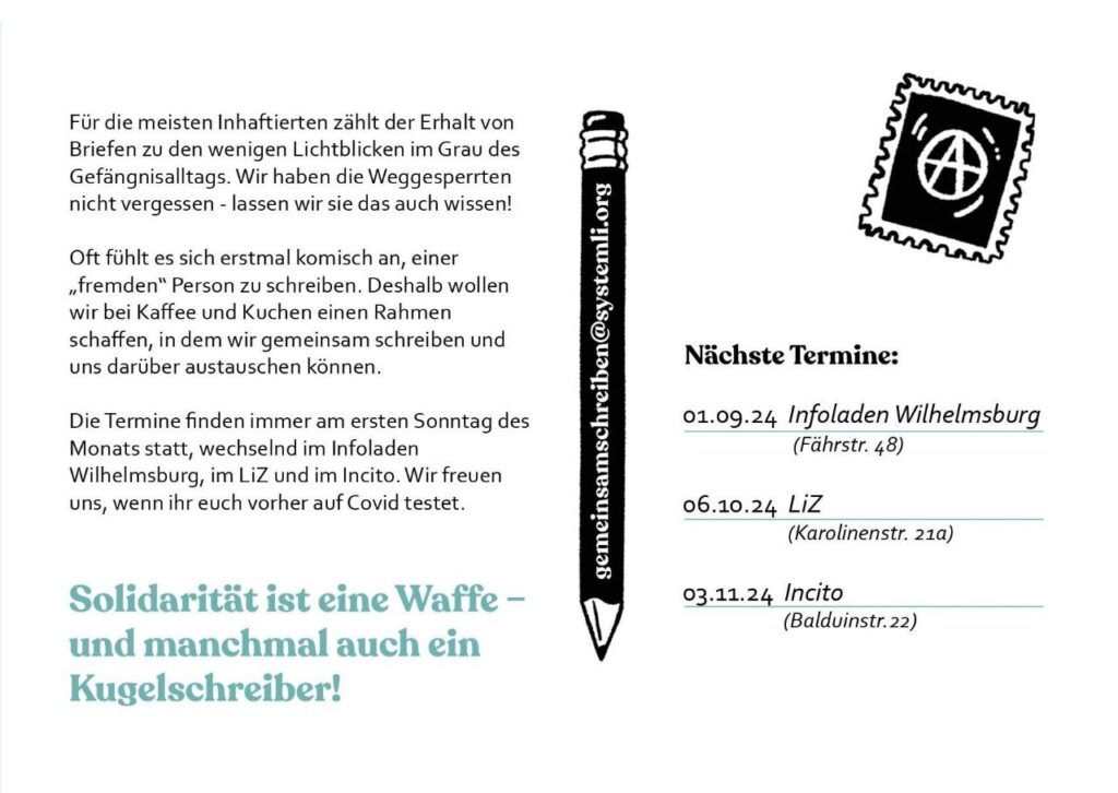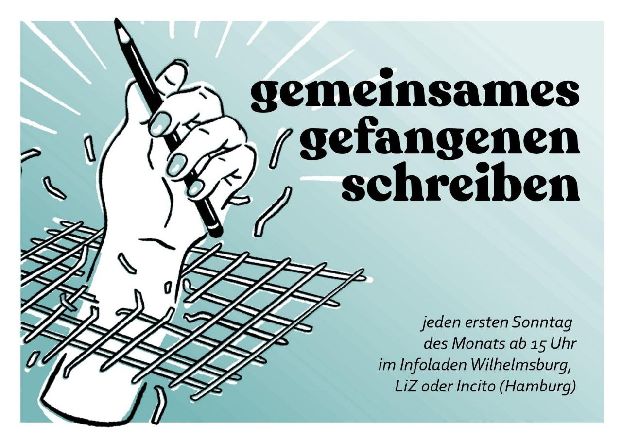 Am Sonntag ist es wieder soweit – das Gefangenen Schreiben findet statt! Diesmal werden wir im Infoladen Wilhelmsburg zusammenkommen um ein paar liebe Worte an Inhaftierte zu schicken.
