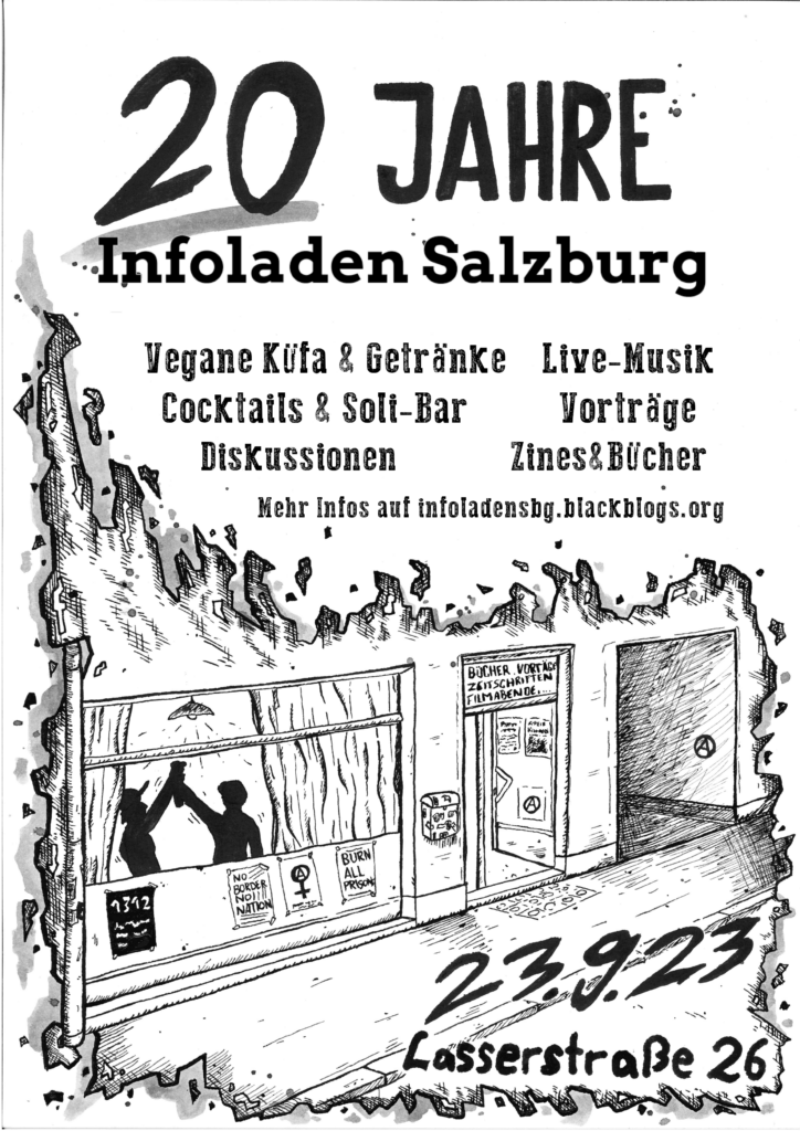Deshalb wollen wir uns in Salzburg zusammentreffen, genauer gesagt am 22. und 24. September, um zwei Tage lang zu diskutieren. Am 23. September findet die Geburtstagsparty des Infoladen Salzburg statt.