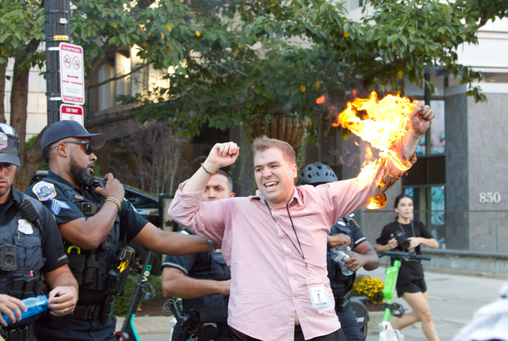 We have more coming from DC about CBS Journalist Samuel Mena Jr III, who was so disgusted by the “both sides” fake “journalism” his bosses had him peddling that he set his left arm on fire at the Oct 5 DC protest for Palestine. He did so to these words:
