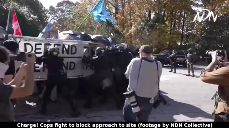 On the 13th of November the Block Cop City march faced off with cops near Weelaunee Forest. The cops lacked the courage or maybe the strength to fight the banner wall protected wedge formation at the lead of the march shield to shield. Instead, they opened up with tear gas and flashbangs. This failed to end the march-and 8 protesters got through and locked down to construction equipment.