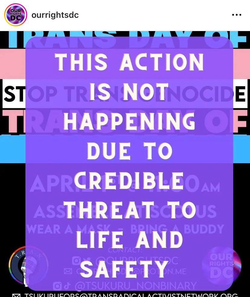This action will not be taking place Saturday due to a credible threat to life and safety. The safety of our trans community is first priority. This threat is the direct result of the flood of raw hatred directed toward the trans community after the Tennessee shooting. Individuals who had nothing to with that heinous act have been subjected to highly serious threats and blamed only because of their gender identity. This is one of the steps in genocide, and we will continue our efforts to protect trans lives. While we wholeheartedly believe in the mission and message we put forth for trans day of vengeance, we must prioritize the safety of our community and the people that make it up.