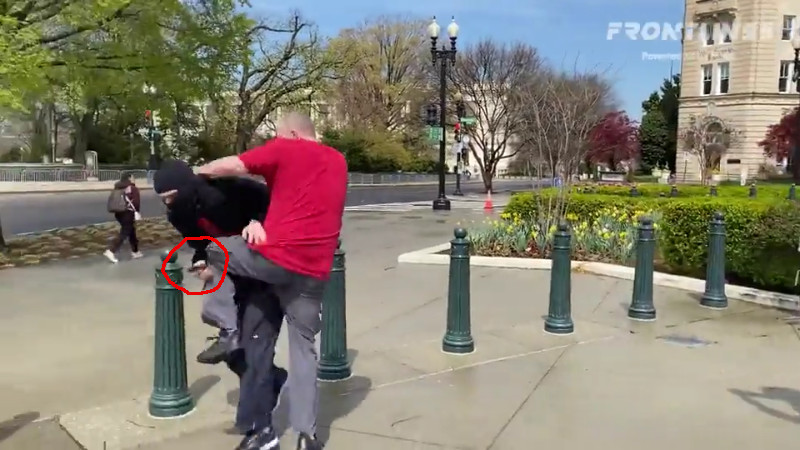 Man in black was holding the “1488” banner, went for his mace (circled-originally thought to be a knife)