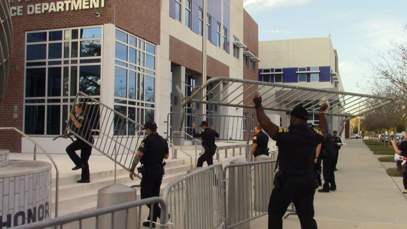 Cops hurredly barricaded the station as marchers approached, apparently the destination of the march caught them by surprise