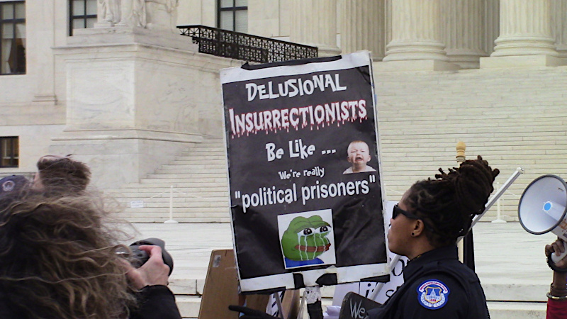 Some of the counterprotesters threw the Proud Boys slogan “fuck around and find out” back at the fascists by saying Ashli Babbatt did exactly that.The fascists started at the Supreme Court, then marched around the Capitol, facing confrontations with counterprotesters both at SCOTUS and at First and Constitution Ave NW. The arrrest of Ashli Babbatt’s mother took place as groups of fascists, Trumpers, and Christian Nationalists were marching around the Capitol in a symbolic siege remembering the real siege and assault two years earlier.
