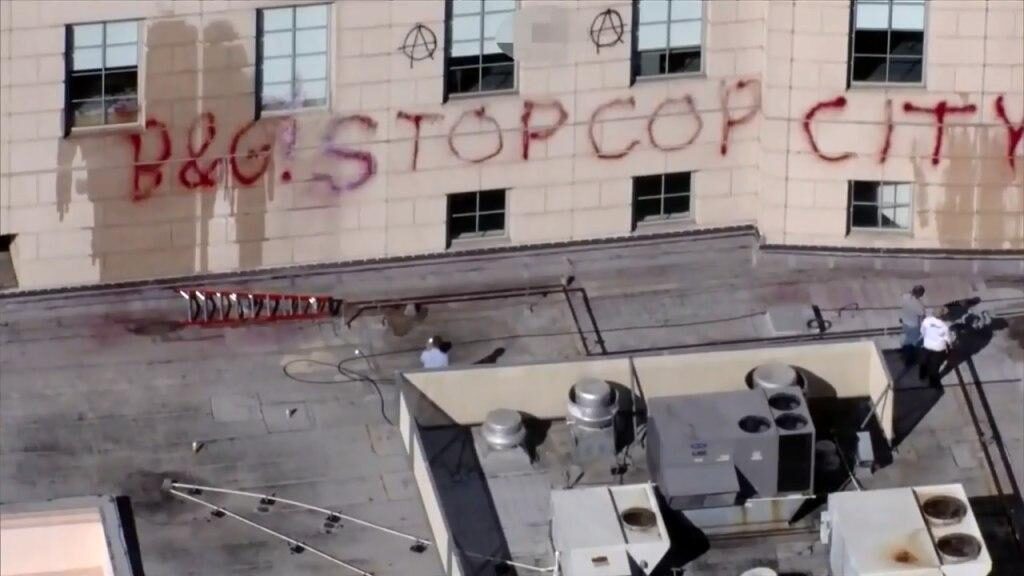 Video is two clips from the FOX video, to show how the graffiti clearly reads “Stop Cop City” and the part at 1 min 17 seconds into the original video where FOX finally admits a different occupant of the hotel being targetted by “a national hate group” was another theory before admitting that Braswell and Gorrie(Cop City general contractor) also has offices in there.