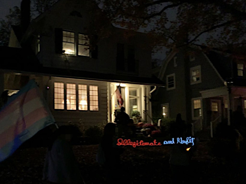 The 16th of November was just one night after Trump’s formal announcement that he is running for the White House again. On that night, protesters again returned to the home of “Justice” Amy Coney Barrett, Trump appointee to the court. She also formerly held the title of “handmaid” in the Christian extremist group People of Praise.