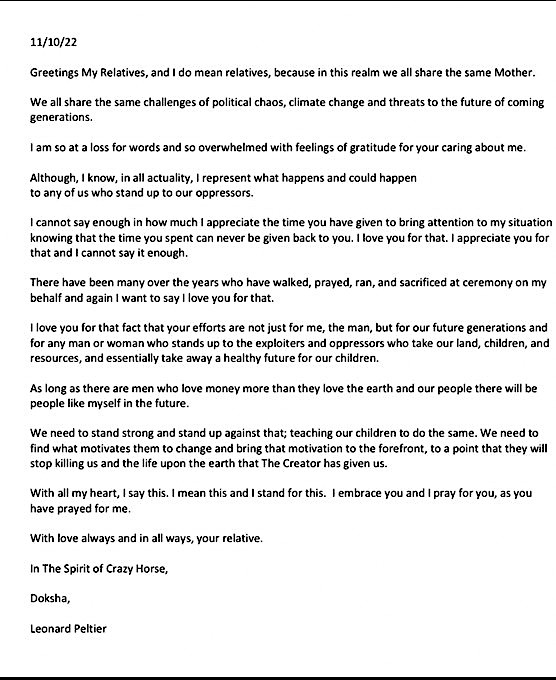 Peltier’s original codefendents were acquitted in a different trial-and jurors later reported they feared US Marshalls would SHOOT them for refusing to convict Indigenous fighters for an act clearly none of them were “guilty” of. Peltier was convicted in a later trial for supposedly shooting the two FBI agents who had invaded the Lakota reservation at Pine Ridge. There is evidence FBI agents lied on the stand, starting with supposedly entering the reservation pursuing a red truck, when Leonard did not have a red truck all red trucks anywhere near Pine Ridge had been stopped for weeks. Peltier’s SUV was orange and white, it was neither red nor a pickup truck. All of the Indigenous witnesses who testified against Leonard later said they only claimed he had shot the agents because they were personally threatened by the FBI. A ballistics report proved the cartridges from which the bullets striking FBI agents came did NOT match the firing pin in Leonard’s weapon. This was intentionally concealed at trial. The ballistics report proves whatever happened on Pine Ridge that day, no bullet striking any FBI agent emerged from Leonard Peltier’s weapon. Thus he cannot be “guilty” of killing any of them.