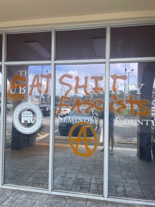 On the morning of August 29, Seminole County GOP fascists found their headquarters tagged with “Eat Shit Fascists.” In addition the locks were glued, forcing the GOP MAGAts to break into their own office by the back door. Seems they do everything by the back door…