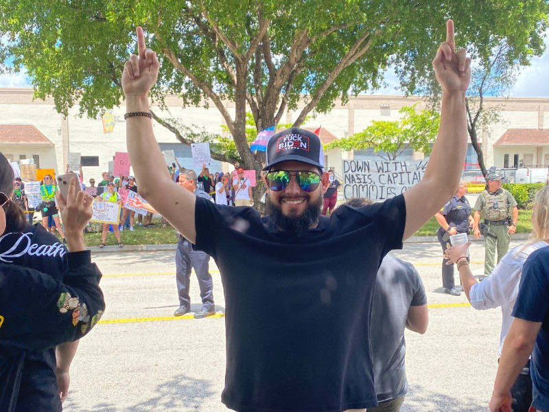 Proud Boy and J6 defendent Gabriel Garcia poses with the protest against DeSantis in the background. Two middle fingers, zero follow-through