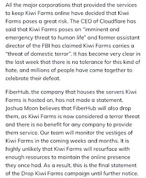 Instead, a campaign lasting just one month has taken down a major terrorist platform responsible for at least three deaths. Who’s the “lolcow” now, Kiwi Farms?