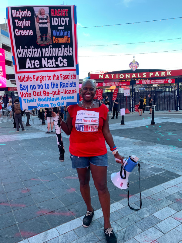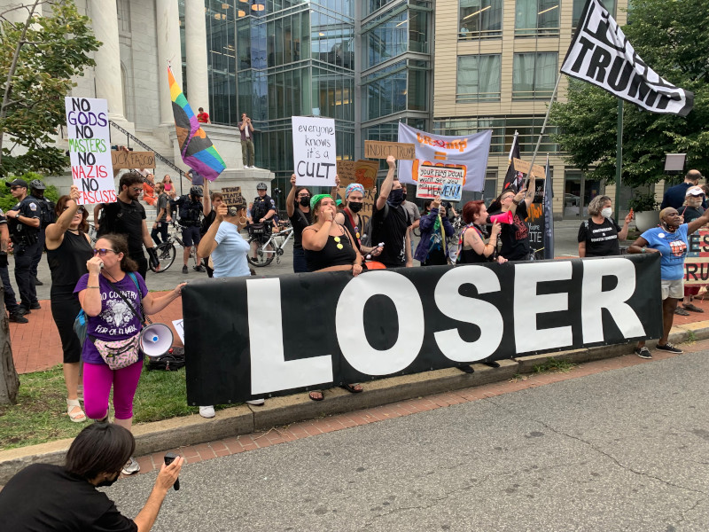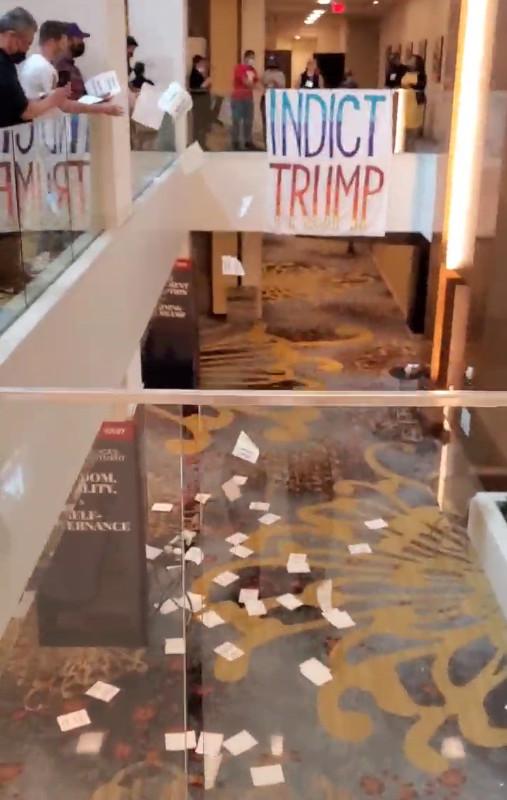 On the 26th of July, Donald Trump returned to DC for the first time since he fled Biden’s Inaugural on Jan 20, 2021. He was the keynote speaker at an indoor “America First” rally at the Marriott Marquis near the Convention Center. Protesters dropped an “Indict Trump” banner inside and chants of “No Trump, no KKK no Fascist USA” resonated from the walls.