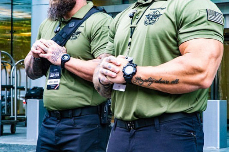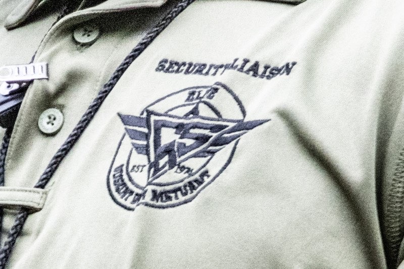 Insignia on Greenshirt uniforms-only the words “security liason” appear where a company name should be. Logo matches Colorado Security Agency-but no label