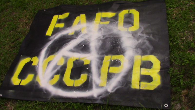 The smaller banner read “FAFO” and “CCCPB.” Unknown what CCCPB means: chapter name, a reference to the Klan-linked “Council of Conservative Citizens” or something else? “FAFO” stands for “Fuck around and Find out” – and that’s exactly what the Proud Boys just did – they fucked around and found out!