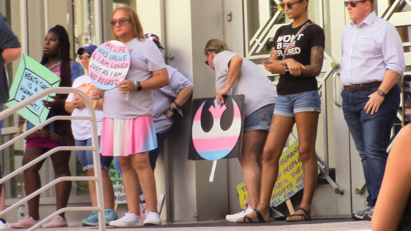 In Florida, fascist and theocratic governor DeSantis (AKA DeSatan) is pushing a proposal before the FL Board of Medicine to replace all gender-affirming care for anyone under 18 with “conversion therapy” and limit access for those over 18. Activists held an emergency protest in Orlando ahead of the major Fri Aug 5 protest at the Board meeting in Ft Lauderdale. Proud Boys and fascist media showed up but were unable to significantly interfere with this protest.