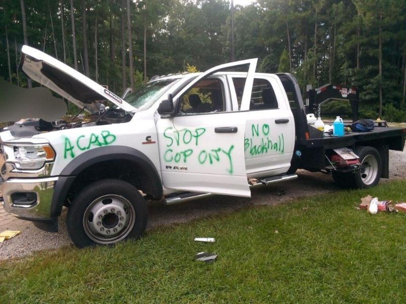 Early Friday July.29th, a tow truck was sent to tow various community members & forest defenders vehicles from the Welaunee People’s Park… Several different autonomous groups took action to stop tow truck, one by slashing tires, smashing windows, graffiti, & generally fucking it up, & a mini excavator was also subsequently ushered out of parking lot near woods & cops kept at bay.