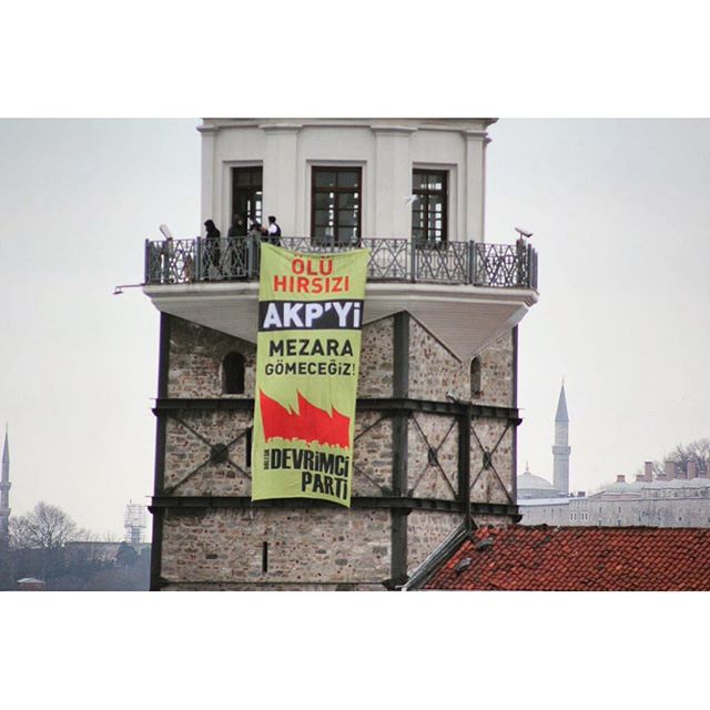Aktivist_innen der Vereinten Revolutionären Partei haben das Istanbuler Wahrzeichen besetzt, um Aufmerksamkeit auf die kriegerischen Angriffe und Handlungen des türkischen Staates in Cizîr und die 23 Verwundeten zu ziehen, die immer noch in einem Haus festsitzen, zu dem keine Rettungskräfte durchgelassen werden.