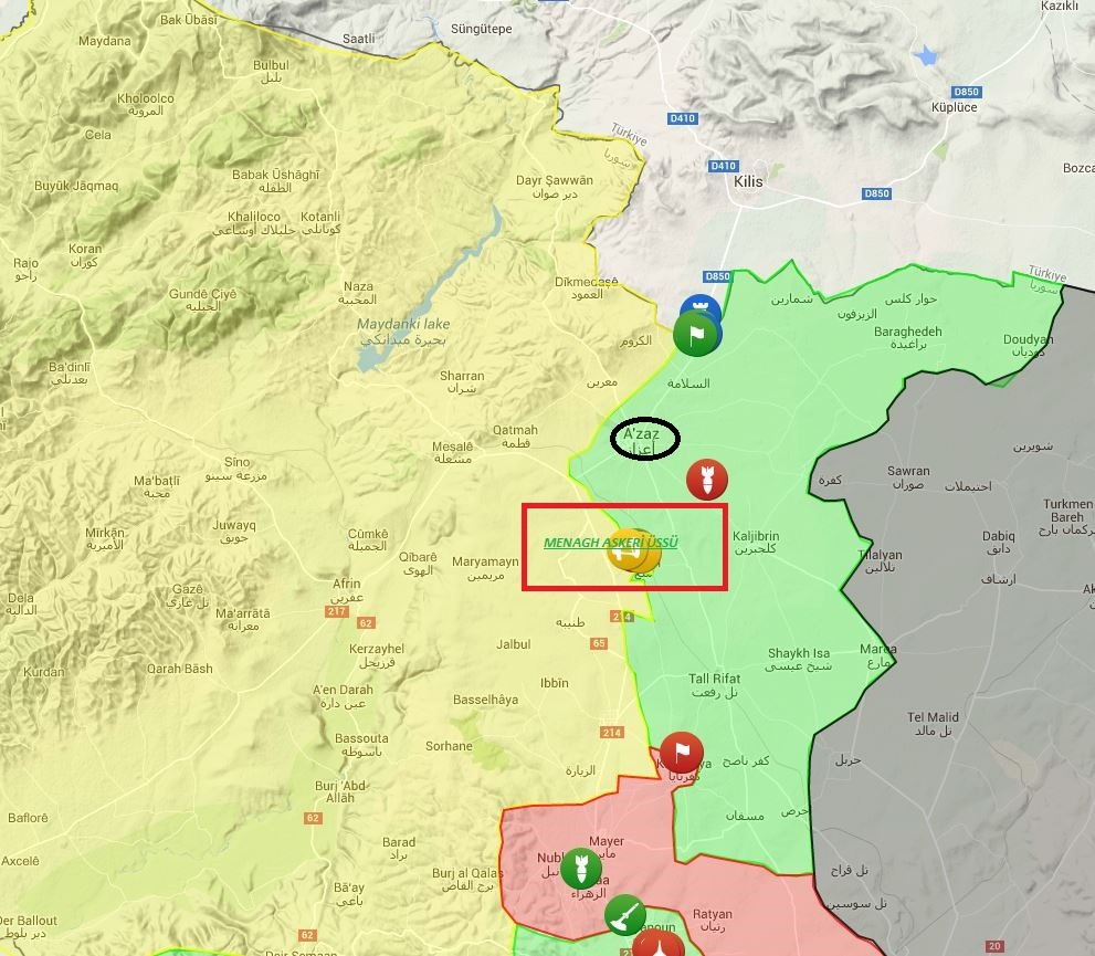 Zu den Hintergründen: Am 11. Februar haben YPG und Ceyş El Suwar (Revolutionäre Armee) die Kontrolle über den der Militärstützpunkt Menagh und das Dörf Minîh erlangt und im Anschluss die Kontrolle al Qaider naher Kräfte über die nahe gelegenen Dörfer Merinaz, Kefer Entuwan und Elqemiya beendet. Der Militärstützpunkt Mengah liegt im Dreieck zwischen Azaz, Afrin und Halep (Aleppo). Dabei war auch die Verbindung zwischen der Türkei und Halep unterbrochen worden.