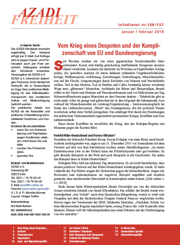 auch in unserer Doppelausgabe Januar/Februar mussten wir den Fokus auf den Krieg des AKP-Regimes gegen die Bevölkerung in den kurdischen Gebieten der Türkei legen. Den aktuellen Informationen zufolge betreibt die türkische Regierung – offenbar in militärischer Kooperation mit Saudi-Arabien – eine immer gefährlicher werdende Eskalation im Norden Syriens, die einen Flächenbrand im gesamten Mittleren Osten und darüber hinaus auslösen kann.