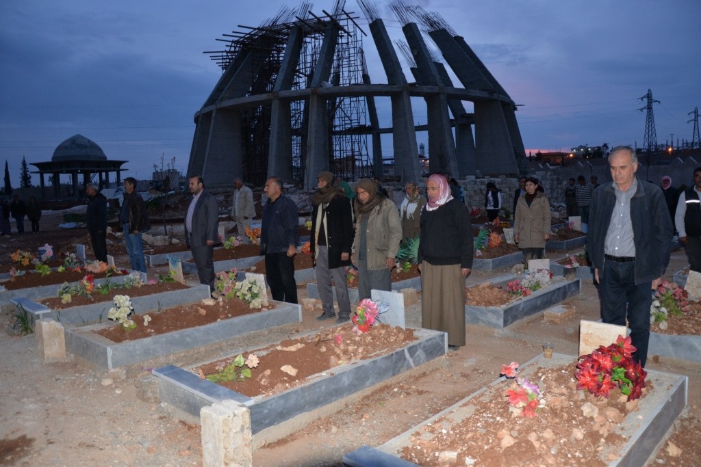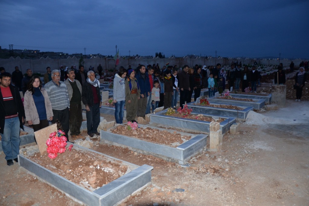 An der Gedenkzeremonie für die gefallenen Märtyrer*innen nahmen auch offizielle Vertreter*innen der Demokratischen Selbstverwaltung, Familien der Märtyrer*innen, Mitglieder verschiedener NGO’s, sowie die Vertretung des Verbandes der Jugend Rojavas (YCR – Yekîtiya Ciwanên Rojava) aus dem Kanton Kobanê.