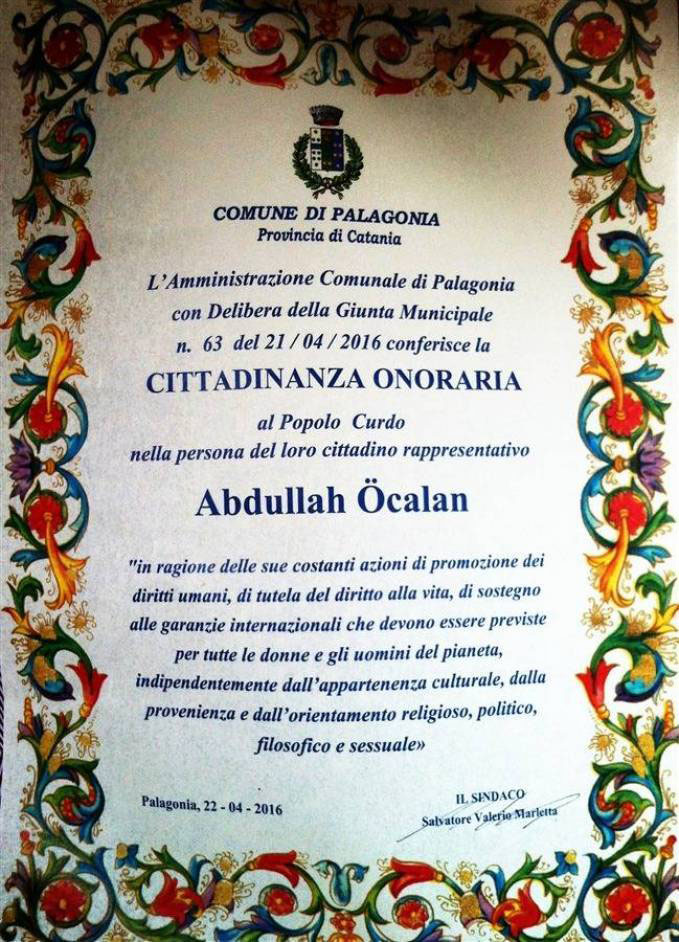 Ehrenbürgerschaft für Abdullah ÖcalanItalien – Im Rahmen der Aktivitäten aus Anlass des Jahrestages der Befreiung vom Faschismus wird Abdullah Öcalan zum Ehrenbürger der Stadt Palagonia im Kreis Catania auf Sizilien erklärt. Der Bürgermeister von Palagonia Savatore Valerio Marletta würdigte in seiner Ansprache im Rahmen des Programms anlässlich des Jahrestages den Widerstand der Kurden und erklärte, dass es Parallelen zwischen dem Widerstand der Kurden und dem Widerstand des italienischen Volkes gegen den Faschismus gibt und wies darauf hin, dass die jetzigen Ereignisse in seinen Augen von „großer Bedeutung“ seien. „Öcalan, als Repräsentant des Volkes, spiele in diesem Kampf eine zentrale Rolle. Obwohl er in Imrali unter Isolationshaftbedingungen steht, leistet er einen großen Widerstand, deshalb verleihen wir ihm die Ehrenbürgerwürde.“ An der Festivität nahm auch der 92-jährige ehemalige Partisan Nicolo di Salvo teil. Er erklärte in seiner Rede, dass er die Bewegung der Kurden auch als ein Teil von sich betrachte.