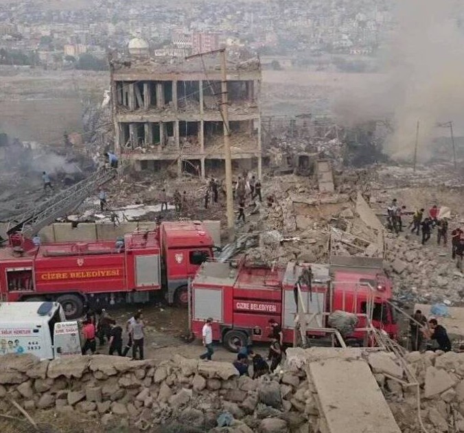 Polizeipräsidium und Wache der Sonderpolizei in Cizîr zerstörtBakur/Nordkurdistan – Das Polizeipräsidium und die Wache der Sonderpolizei (Çevik Kuvvet) in Cizîr (Cizre) wurden bei einem Bombenanschlag zerstört. Gegen 7.00 Uhr morgens fuhr ein Fahrzeug vor. Am Kontrollpunkt, 50 Meter vor der Wache, wurde das Fahrzeug aufgehalten. Es soll zum Gefecht gekommen sein, das Fahrzeug explodierte noch am Kontrollpunkt. Trotzdem wurden die Gebäude des Polizeipräsidiums und die Wache der Sonderpolizeieinheiten großteils zerstörst. Ein Brand, der durch die Explosion entstanden war, griff schnell auf das Materiallager der Polizei über. Bei der Explosion wurden 11 Polizisten getötet, 78 Menschen, darunter 75 Polizisten verletzt. Unter den Verletzten befindet sich auch der Vertreter des Staates in Cizîr, Gouverneur Ahmet Adanur.