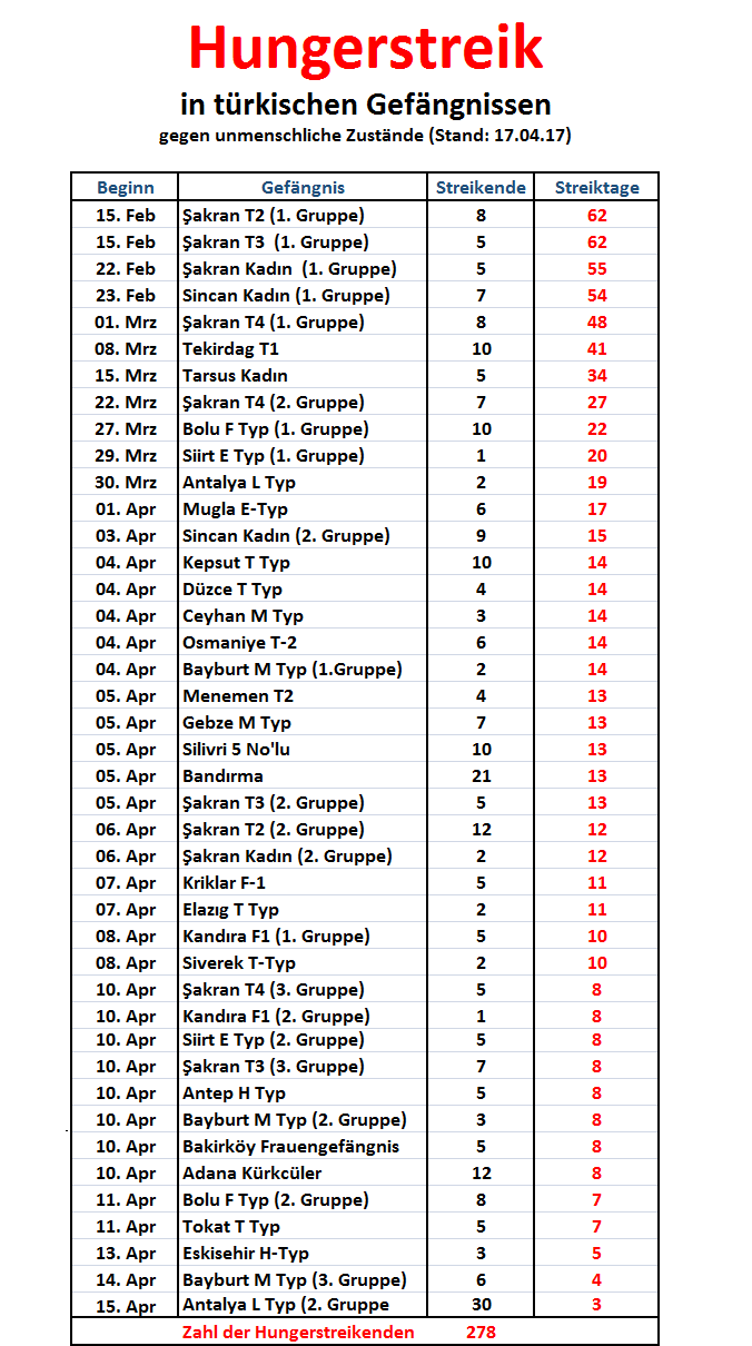 Der Hungerstreik der politischen Gefangenen in der Türkei dauert nun mehr seit 63 Tagen an. Allein etwa 300 Gefangenen sind im unbefristeten Hungerstreik, Tausende andere, unterstützen ihn durch zeitlich begrenzte Hungerstreikaktionen.