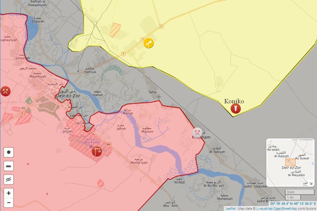 Demokratische Föderation Nordsyrien – Die Syrischen Demokratischen Kräfte (QSD) berichten, dass russische Jets ihre Positionen um die Koniko Gasfabrik nordöstlich von Deir ez-Zor angegriffen haben. Die demokratischen Kräfte konnten das Gebiet am 23. September vom IS befreien.