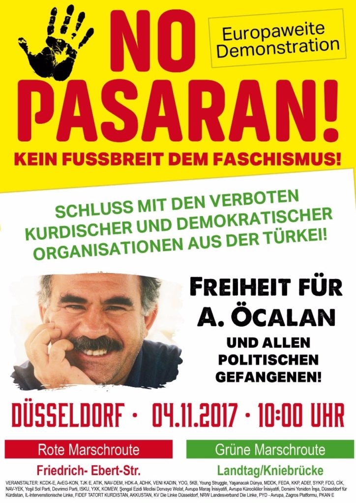 „Als Zusammenschluss von über 40 unterschiedlichen Organisationen und Gruppen mit kurdischem, türkischen und deutschen Hintergrund organisieren wir für den 4. November 2017 eine europaweite Demonstration in Düsseldorf. Nach der Anmeldung unserer Demonstration mit dem Motto „Kein Fuß breit dem Faschismus! Schluss mit den Verboten kurdischer und demokratischer Organisationen aus der Türkei! Freiheit für Abdullah Öcalan und alle politischen Gefangenen!“ wurden der Demonstration aufgrund einer politischen Entscheidung eine Vielzahl von Verboten auferlegt. Auch wenn die Demonstration erlaubt ist, werden mit den Auflagen für den Verkauf von Büchern und Musik-CDs, die unseren kulturellen Reichtum und unseren politischen Willen zum Ausdruck bringen, umfangreiche Verbote ausgesprochen. Sogar das natürlichste Recht, der Verkauf von Essen und Getränken, ist verboten!