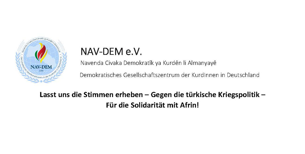 Wir rufen zudem euch, also die Öffentlichkeit in Deutschland, dazu auf, eure Solidarität mit Afrin zu zeigen und euch mit uns gemeinsam gegen die Kriegspolitik der AKP im Mittleren Osten zu stellen! Lasst uns gemeinsam unsere Stimmen für den Frieden erheben!