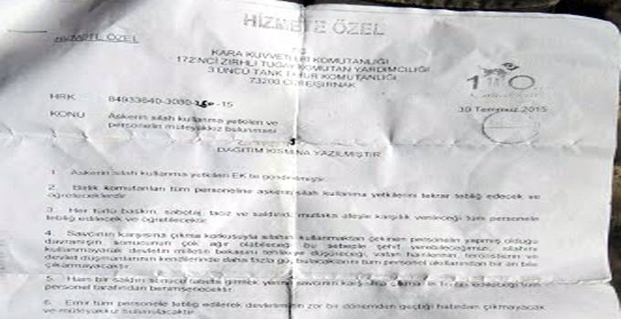 Das Dokument mit dem Aktenzeichen: ‚84933840-3000-350-15‘ trägt den Titel: ‚Das Recht der Soldaten zu schießen und die Wachsamkeit der Einheiten‘ und wurde am 30. Juli 2015 von der 3. Panzerbattaillonskommandantur in Cizîr/Şirnex (türk. Cizre/Şırnak) an die 172. gepanzerte Brigade, die Vertretungskommandantur der Landstreitkräfte übermittelt.