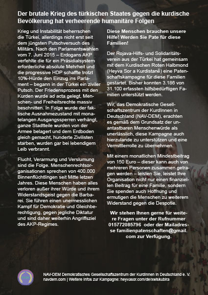 Die Familien in Şirnex benötigen ebenso unsere Unterstützung, wie die Menschen in Nisebîn (Nusaybin), im Bezirk Sur (Altstadt von Amed), Cizîr (Cizre) und anderswo. Da nun die Hilfsorganisationen vor Ort verboten wurden, bleibt nur noch der Weg, die Familien direkt zu unterstützen. Hier setzt das Projekt der Familienpatenschaften an.