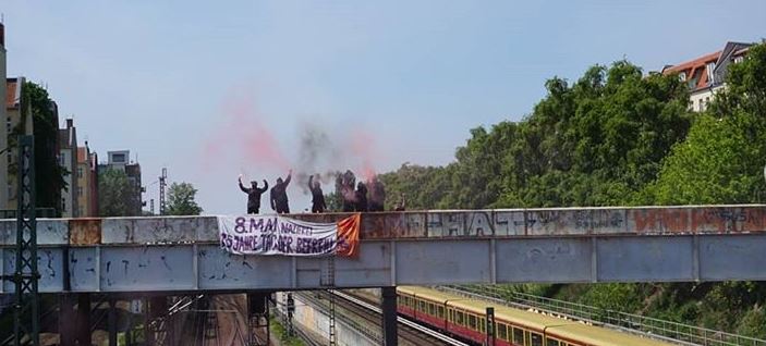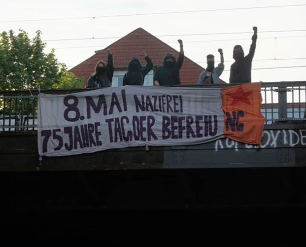 Am 8.Mai 1945 wurde in Berlin der Kapitulationsvertrag der Deutschen Wehrmacht unterschrieben. Millionen Menschen sind unter dem Naziregime ermordet worden. Heute, 75 Jahre später gedenken wir der Befreiung. Aus diesem Anlass haben wir ein Banner mit der Aufschrift „8. Mai nazifrei – 75 Jahre Tag der Befreiung“ gemalt und an einer Brücke in der Nähe der Schönhauser Allee aufgehangen, während wir aus den Häusern angeschrien wurden. Fünf Minuten später wurde das Transpi von einem Anwohner abgerissen und einige unserer Genoss*innen angegriffen. Das zeigt uns, dass wir nicht vergessen dürfen, dass in Deutschland der Faschismus wieder wächst. In der Polizei, Bundeswehr oder anderen staatlichen Institutionen haben wir immer mehr Faschist*innen. Es häufen sich rassistische Morde ob in Halle, Hanau Chemnitz oder Celle. Rechte Gruppen wie der Dritte Weg, die Identitäre Bewegung, Ein Prozent oder die Hygiene Demos gewinnen an Zuwachs. Lasst uns der Befreiung gedenken, aber auch alles tun, damit wir nicht wieder in einen Faschismus rutschen.
