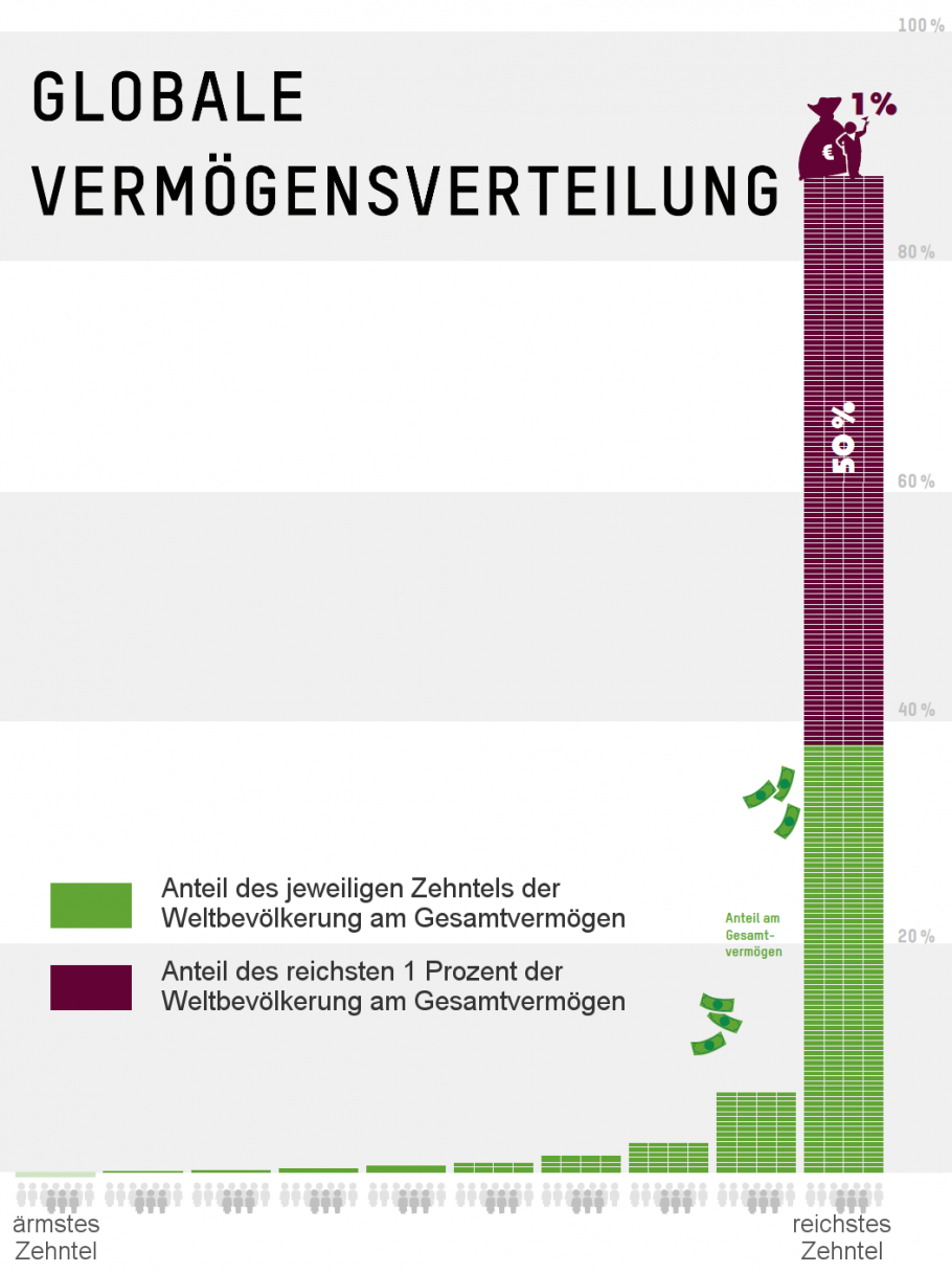 Nach einem Bericht von Oxfam erreichte 2017 der Anteil des reichsten Zehntels der Weltbevölkerung am Gesamtvermögen 82%. Ein Prozent der Weltbevölkerung besitzt die Hälfte des Gesamtvermögens. (Pimentel et al. 2018, S.8)